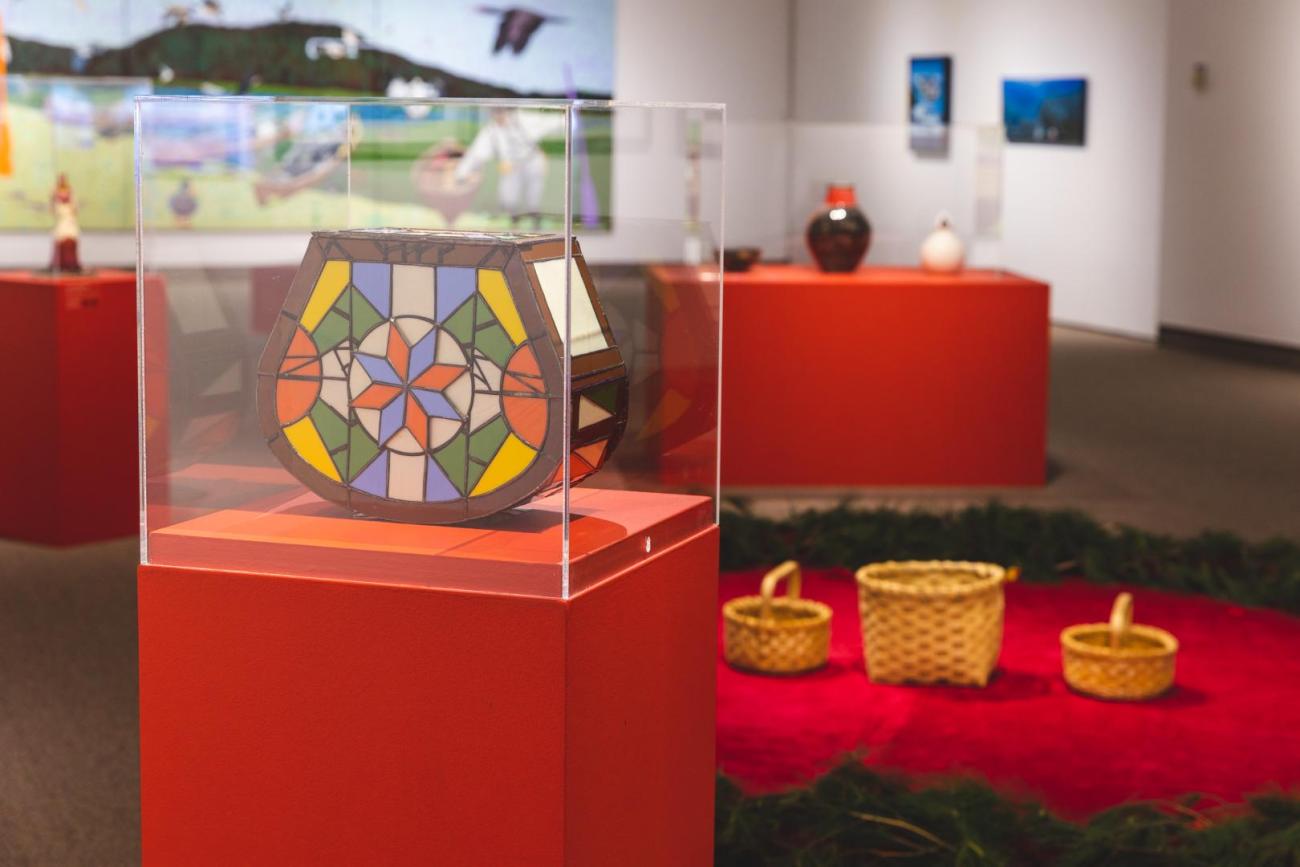 Aujourd’hui, avec mon expérience et mon savoir ancestral, ma culture et mes traditions, je désirais rassembler, au Musée du Bas-St-Laurent sur le territoire Wolastoqiyik Wahsipekuk, des artistes remarquables issu.e.s de la Confédération Wabanaki qui ont une pratique artistique variée. C’est un moment historique puisque nous sommes assis.e.s dans le même cercle pour la première fois depuis des décennies sur ce territoire. Ainsi, des artistes et artisan.e.s des communautés Wolastoqiyik, Mi’kmaq, Penobscot et Passamaquoddy sont réuni.e.s pour partager leurs créations artistiques. Les artistes allient des matériaux nobles, issus de la nature, et des matériaux contemporains, issus de l’industrialisation, tout en conservant un profond ancrage dans la culture ancestrale.